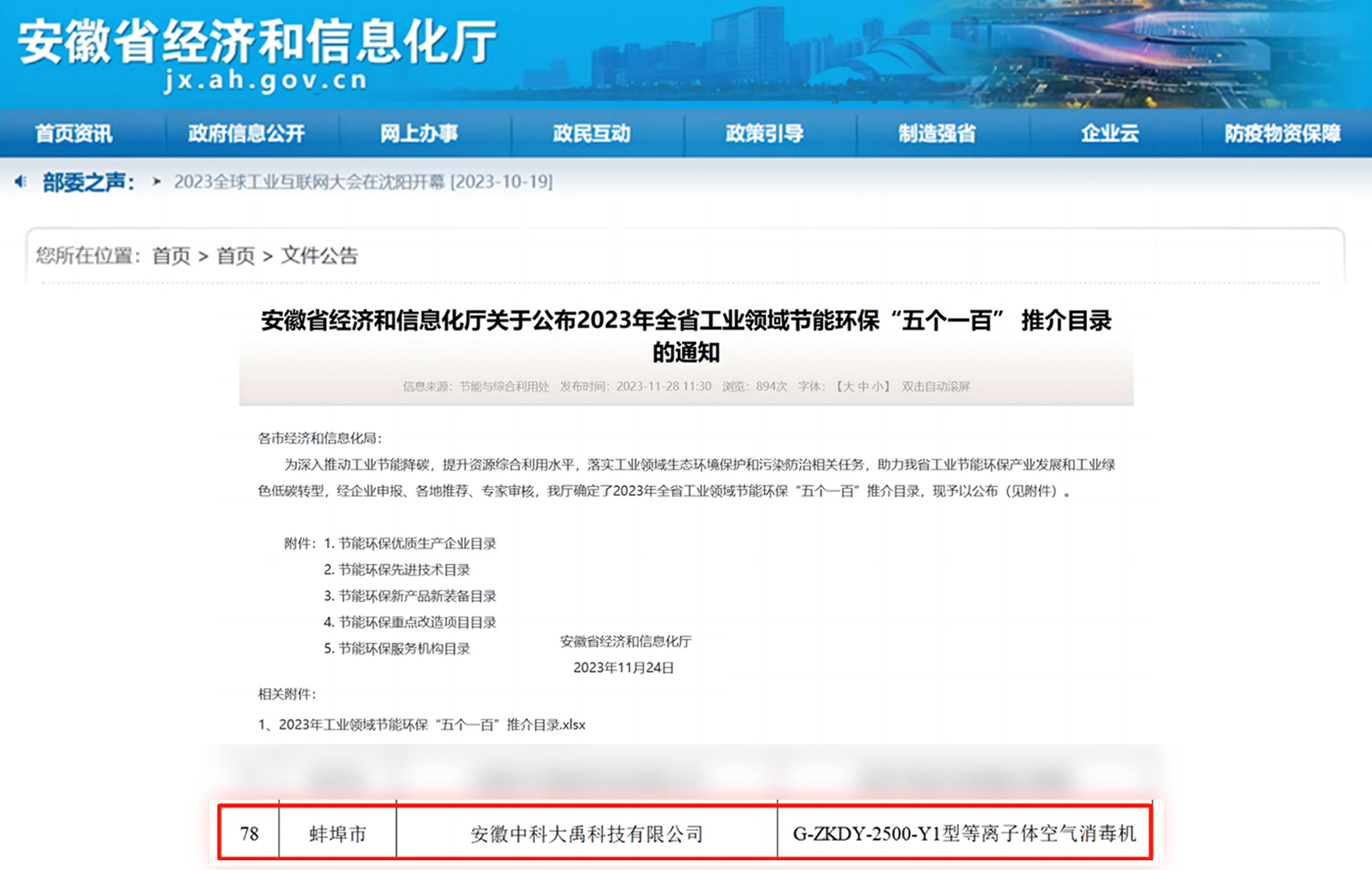 入選2023年全省工業領域節(jié)能環(huán)保“五個一百”推介目錄(節(jié)能環(huán)保新產品新裝備:G-ZKDY-2500-Y1型等離子體空氣消毒機)